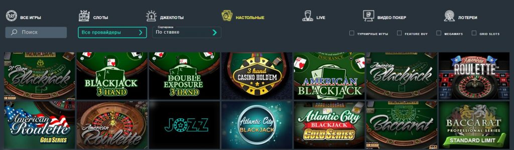 Настольные игры собраны на отдельной странице, открыть которую можно из главного меню. Здесь присутствуют разнообразные версии блэкджека, покера, рулеток и некоторых других игр. В сумме здесь около 70 игр.